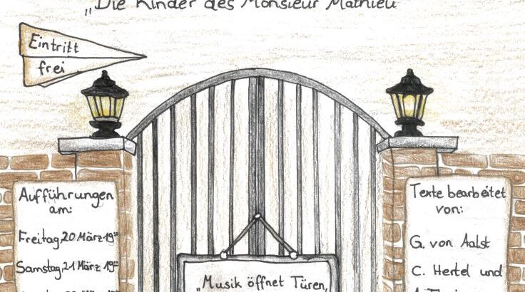 Die Klasse 8 A erfreut uns am 20. und 21. März um 19:00 Uhr und am 23. März um 15.00 Uhr mit einem Singspiel nach dem Film „Die Kinder des Monsieur Mathieu“. Der Musiklehrer in dem strengen Jungeninternat „Fond de l’Etang“ wandelt durch Musik und Verständnis die als schwer erziehbar geltenden Kinder positiv und fordert den grausamen Direktor heraus.