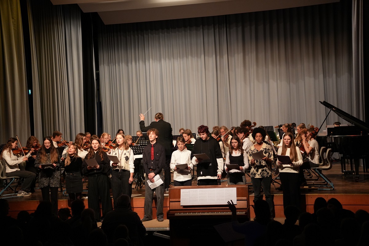Damit kann es endlich los gehen, die Musizierenden beider Orchester, Mittel- und Oberstufe, nehmen Platz und der Unterstufenchor stellt sich auf die Podeste vor der Bühne. Unter der Leitung von Charlotte Paashaus eröffnen die Jüngsten der Mitwirkenden das Programm mit „Macht hoch die Tür“. Stimmig und andächtig klingt es in den Saal, mit den späteren Programmpunkten „Licht der Weihnacht“ und insbesondere dem rhythmisch und stimmlich höchst anspruchsvollen Spiritual „Let my light shine bright“ zeigen die „Kleinen“, dass auch sie äußerst „Oho!“ sind.